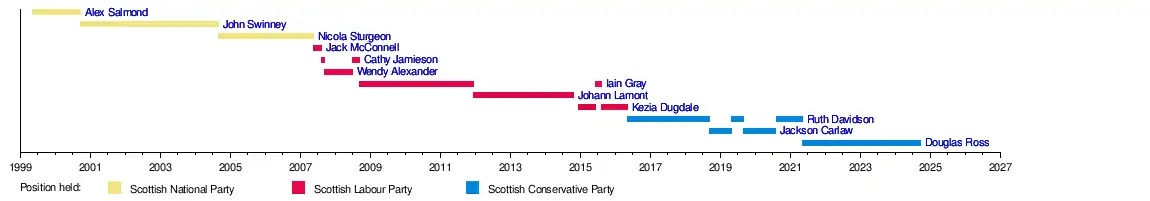 On 27 September 2024, following a leadership election within the Scottish Conservative and Unionist Party,[2] Russell Findlay succeeded Douglas Ross, who had served in this role from 2021 to 2024, as Leader of the Opposition in Holyrood.