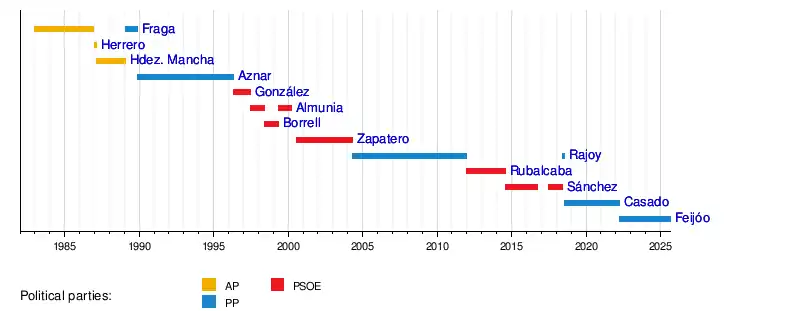 Pedro Sánchez nominally re-assumed the title once he was reelected as PSOE leader in June 2017, although he did not have a seat in parliament as a result of him resigning in protest to his party tolerating Rajoy's second government in October 2016.[41] The position was left vacant after Mariano Rajoy was ousted as prime minister in a motion of no confidence on 2 June 2018—with Rajoy himself rejecting to assume the title again—, until the election of Pablo Casado as new PP leader.[42] From 23 February 2022, the position was again left vacant following an internal PP rebellion, led by Galician and Madrilenian presidents Alberto Núñez Feijóo and Isabel Díaz Ayuso, that resulted in the downfall of Casado as party leader following his abandonment by most of his party's colleagues and other leading members.[43][44]
