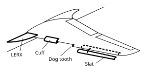 A dogtooth is a small, sharp zig-zag break in the leading edge of a wing. It is usually used on a swept wing, to generate a vortex flow field to prevent separated flow from progressing outboard at high angle of attack.[1] The effect is the same as a wing fence.[2] It can also be used on straight wings in a drooped leading edge arrangement.
