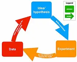 The Build–Measure–Learn loop emphasizes speed as a critical ingredient to customer development. A team or company's effectiveness is determined by its ability to ideate, quickly build a minimum viable product of that idea, measure its effectiveness in the market, and learn from that experiment. In other words, it is a learning cycle of turning ideas into products, measuring customers' reactions and behaviors against built products, and then deciding whether to persevere or pivot the idea; this process repeats as many times as necessary. The process can also be viewed as a test of hypotheses. The phases of the loop are: Ideas → Build → Product → Measure → Data → Learn.[26][27]