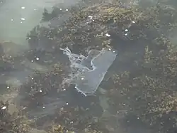 Pacific leatherbacks migrate about 6,000 mi (9,700 km) across the Pacific from their nesting sites in Indonesia to eat California jellyfish. During these long traveling periods, Remora remora (common remoras) will latch onto leatherbacks and display phoresis behavior or 'hitchhiking'; this represents commensalism, where one species is benefiting while the other species is not gaining or losing anything.[72] One cause for their endangered state is plastic bags floating in the ocean. Pacific leatherback sea turtles mistake these plastic bags for jellyfish; an estimated one-third of adults have ingested plastic.[73] Plastic enters the oceans along the west coast of urban areas, where leatherbacks forage, with Californians using upward of 19 billion plastic bags every year. Plastic bags were banned in California in 2016.[74]