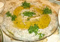 Cheese, as well as yogurt and eggs, are used in the cuisine of Lebanon. One of the more recognizable dishes within Lebanon is labneh. Unlike regular yogurt, labneh is strained so as to remove the watery whey, leaving a thicker, creamier consistency. It is spreadable and garnished with olive oil and sea salt.[48] It is an extremely versatile dish that can be served in a mezze platter for either breakfast or dinner. A variant is mixed with garlic.[48] Ejjeh is the traditional omelette of Lebanon.[49] It is made with egg, chopped parsley and scallions. Within Lebanon, people make this omelette with different herbs that are cultivated from their village.[50][51]