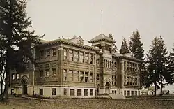 Lebanon High School was originally built in the spring of 1909 across the street from the old Santiam Academy (established 1851), at a cost of $40,000, by Mr. McChesney of Albany, Oregon, contractor, and P.C. Brown of Portland, Oregon, architect. At the time, the building was the pride of Lebanon and "was modern in every way, complete with a brick structure, concrete foundation, and several large grade rooms, four classrooms, a large assembly room along with a library, office, halls, and a basement".[4] These modern features extended to include electricity, running water, and central heating.