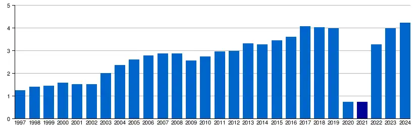 In 2007, nearly 2.9 million passengers passed through the airport, an 88% increase in just seven years and more than twice as many compared with 1997 (1.2 million).