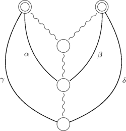 In the following figures, simple circle nodes represent vertices, double circle nodes represent subtrees, twisted segments represent tree paths, and curved arcs represent cotree edges. The root of each tree is shown at the bottom of the figure. In the first figure, the edges labeled and are T-alike, meaning that, at the endpoints nearest the root of the tree, they will both be on the same side of the tree in every planar drawing. In the next two figures, the edges with the same labels are T-opposite, meaning that they will be on different sides of the tree in every planar drawing.