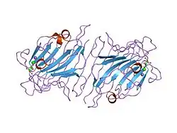 It is one of the largest lectin families with more than 70 lectins reported in a review in 1990.[1] Leguminous lectins consist of two or four subunits, each containing one carbohydrate-binding site. The interaction with sugars requires tightly bound calcium and manganese ions. The structural similarities of these lectins are reported by the primary structural analyses and X-ray crystallographic studies.[2][3] X-ray studies have shown that the folding of the polypeptide chains in the region of the carbohydrate-binding sites is also similar, despite differences in the primary sequences. The carbohydrate-binding sites of these lectins consist of two conserved amino acids on beta pleated sheets. One of these loops contains transition metals, calcium and manganese, which keep the amino acid residues of the sugar-binding site at the required positions. Amino acid sequences of this loop play an important role in the carbohydrate-binding specificities of these lectins. These lectins bind either glucose, mannose or galactose. The exact function of legume lectins is not known but they may be involved in the attachment of nitrogen-fixing bacteria to legumes and in the protection against pathogens.[4][5]