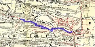A charter supplement issued on March 22, 1859 allowed the Quakake Railroad to extend its line westerly into the headwaters of Mahanoy Creek and down the stream or up its branches "as far as may be expedient", and build branches of up to 10 miles to coal mines. Under this authority, the Quakake built an extension in 1860 via Delano to Mount Carmel, where it connected to the Northern Central Railway's Shamokin Valley and Pottsville Railroad.[1] Another charter supplement on March 21, 1860 allowed it to buy its roadbed from the CW&E,[1] which was then being foreclosed and reorganized as the Catawissa Railroad.