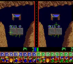 The original Lemmings also has 20 two-player levels. This took advantage of the Amiga's ability to support two mice simultaneously, and the Atari's ability to support a mouse and a joystick simultaneously.[29] Each player is presented with their own view of the same map (on a vertically split screen), can only give orders to their own lemmings (green or blue), and has their own base. The goal is to get more lemmings (regardless of colour) into one's own base than the other player. Gameplay cycles through the 20 levels until neither player gets any lemmings home.[24]