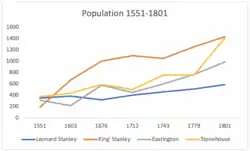 The census figures for 1801 records there were 590 villagers living in Leonard Stanley giving an overall estimated growth rate of 68% for the years between 1551 and 1801. This was considerably less than in the surrounding towns and villages with King's Stanley growing by 671% over the same period.[15]