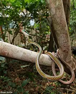 Leptophis ahaetulla, commonly known as the lora or parrot snake, is a species of medium-sized slender snake of the family Colubridae.[4] The species is native to Central America and northern South America.[5]