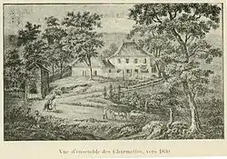 In 1728, a young Jean-Jacques Rousseau fled a watch-making apprenticeship in nearby Geneva and took refuge with Françoise-Louise de Warens, or Madame de Warens, who became his mistress and mentor. They first resided in the city of Annecy before moving on to Chambéry. Madame de Warens - whom Rousseau affectionately referred to as maman (mother) - was 13 years Rousseau's senior. From the summer of 1736, Rousseau and maman moved into a country house called Les Charmettes in the neighborhood of Chambéry. Located in the hollow of a wooded valley, Les Charmettes figures prominently in Rousseau's Confessions (Books V and VI). According to him, his short sojourn at Les Charmettes constituted "the short period of my life's happiness" and was instrumental in the development of his love of nature and the simple country life.[1] During the revolutionary and subsequent Romantic periods, Les Charmettes became a symbol of Rousseau's revolutionary thought as well as a shrine attracting such literary and political celebrities as George Sand and Alphonse de Lamartine. In 1905 Les Charmettes was classified an historical monument by the French government. The house and its grounds are now a museum open to the public.