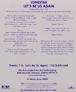 "Let's Be Us Again" is a song recorded by American country music group Lonestar. The song reached the Top 5 on the Billboard Hot Country Singles & Tracks (now Hot Country Songs) charts. It was released in March 2004 as the first single and title track from their album of the same name. Then-lead singer Richie McDonald co-wrote the song with Maribeth Derry and Tommy Lee James.[1]