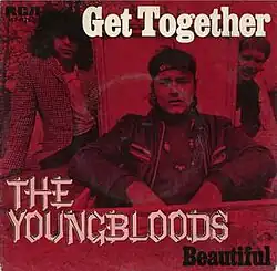 The most notable recording of "Let's Get Together" came in 1967, when The Youngbloods released their version under the title "Get Together", from their debut album The Youngbloods. Initially released as a single in July 1967, it became a minor Hot 100 hit for them, peaking at No. 62.[9] However, renewed interest in the Youngbloods' version came when it was used in a radio public service announcement as a call for brotherhood by the National Conference of Christians and Jews.[1] It was subsequently re-released in 1969, and peaked at No. 5 on the Billboard Hot 100 and reaching No. 37 on the US Adult Contemporary chart. It was their only top 40 hit on the Hot 100.[10]
