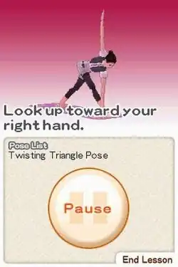When the player selects a Yoga pose, the game offers voice and video instructions to the player to direct their pose.[2] The game does not offer a preview of the selected yoga pose before starting.[2] The game requires the player to enter in information about their completed exercises as the game has no way of measuring whether the user actually completed the exercises or not.[2]