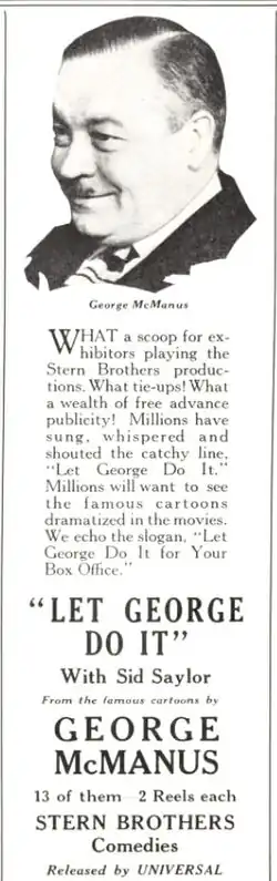 The films (40 in all) were based on the comic strip Let George Do It, which was written and drawn by George McManus (who later created the more famous strip Bringing Up Father).[1][2][3] The series was produced by the Stern Brothers (Julius Stern and Abe Stern)[1] and was one of many silent comedy series issued by Universal Pictures.