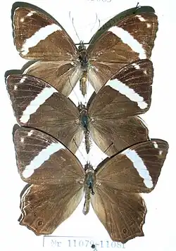 Underside uniform brown; forewings and hindwings with subbasal, subterminal and terminal sinuous lilacine-white lines; forewing with the oblique discal white bar as on the upperside, followed by a subapical lilacine patch bearing three small ocelli in vertical order, and with a very short, oblique, white bar joining it to the costa. Hindwing with a sinuous, irregular, angulated discal lilacine-white line and a strongly arched series of black ocelli speckled with white in the centre, with an inner ochraceous, intermediate brown, and outer lilacine ring. Antenna, head, thorax and abdomen dull brown; antennae ochraceous at apex.[1] Wingspan: 54–64 mm.