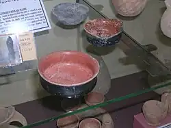 This is a selection of handmade pottery in different ware styles. These styles are called: Base Ring, White Slip, Monochrome, White Shaved, White Painted, Bucchero. Of these different kinds, Monochrome, White Slip, and Base Ring were most used. It appears as though this type of pottery was found to be decorative in nature rather than useful.[5] "Bilbil juglets" are an example of Base Ring ware, which are pottery and have long slim necks.[6][7] Archaeologists speculate that bilbil juglets may have been used in the trade of opium, due to traces of opiates found in some of the styles of the jugs, as well as the shape of the vessel resembling an upturned Papaver somniferum.[8]