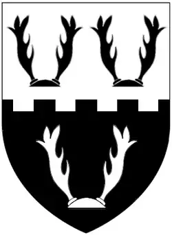 - 1st: Per fess embattled argent and sable, three buck's attires each fixed to the scalp counterchanged (Buck);