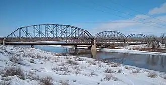 The Lewis and Clark Bridge is a historic bridge in Wolf Point, Montana, which once carried Montana Highway 13 across the Missouri River between McCone and Roosevelt counties. It is also known as Wolf Point Bridge, Missouri River Bridge, or Site No. 24RV438. The bridge is a five-span Pennsylvania through truss; its longest span is the longest through truss span in the state at 400-foot (120 m). Completed in 1930 by the Missouri Valley Bridge and Iron Company, the bridge was the first bridge across the Missouri River at Wolf Point and the only bridge along the river for a 350-mile (560 km) stretch. The bridge's opening ceremony, which took place on July 9, drew over 10,000 visitors and included five bands and a fireworks display. After its completion, the bridge became a popular tourist attraction for motorists in northeastern Montana and a point of civic pride for Wolf Point's residents.[2]