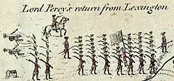 Only one British officer remained uninjured among the three companies at the head of the British column as it approached Lexington. He understood the column's perilous situation, with few men having ammunition and the men so fatigued that flankers could not be kept out.[95] He then heard cheering further ahead. A full British brigade, about 1,000 men with artillery, under the command of Earl Percy, had arrived. The time was about 2:30 p.m. The original British column had been on the march since 2:00 a.m.[96]