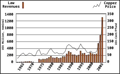| Ley 13.196 (19 November 1958) | 8,5 Mio. US$ | 15% of the tax revenue from the copper big corporations (tax was 50%) | Introduction of compensation payment if a lowest amount can't be reached; changeover to US$ |