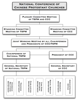 The TSPM and CCC together form the constituent organizations of the National Conference of Chinese Protestant Churches.[1] The distinctive roles of the TSPM and CCC are hard to distinguish due to overlaps but both organizations maintain separate Standing Committees.