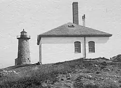 The light station was authorized in 1817, and its first tower was a wood-frame structure that was blown down about 1822. The present tower was built in 1823,[2] and a keeper's house added the following year.[5] A fourth-order Fresnel lens was installed in the tower in 1855, and a fog signal and several outbuildings were built the following year. The present fog signal house was built in 1884. Only the light tower, the fog signal house, and the boat launch still survive, all other buildings, including the keepers' houses, were removed. The light was automated in 1974, and converted to solar power in 2000.[2] The Island was added to the Petit Manan National Wildlife Refuge in 1998.[6] The Island is closed to visitors during the bird nesting season, and the tower is maintained as an active aid to navigation by the USCG and is closed to the public.