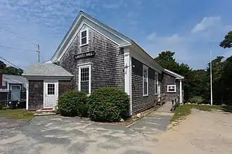 Liberty Hall is a historic community building in the Marstons Mills village of Barnstable, Massachusetts. The 1+1⁄2-story structure was built in 1859 by a local community group as a function hall. It has modest Greek Revival styling, with an entablature and corner pilasters, large 12-over-12 sash windows, and an entry vestibule projecting at an angle from one corner. It continues to be used as a community function space, although it was adapted for a time as the local Methodist church's parish hall.[2]