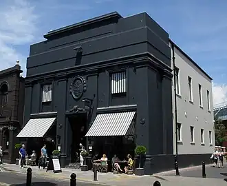 The first true library in Brighton opened in or before 1760 on the Steine (now Old Steine), although a bookshop existed from 1759 on East Street.[13] Baker's Library was the first building erected on the east side of the Steine:[14] it stood on the south corner of the present St James's Street, where St James's Mansions stand now. Its proprietor was Mr E. Baker of Tunbridge Wells, another 18th-century resort town.[C 1] A small wooden building with a veranda and an attached rotunda for musicians to perform in, "it was more like a club" than a modern library: its other features included billiards tables.[15][16] It was enlarged in 1806, necessitating the demolition of the original building.[17]