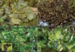 A cyanolichen is a lichen with a cyanobacteria as its main photosynthetic component (photobiont).[14] Many cyanolichens are small and black, and have limestone as the substrate. Another cyanolichen group, the jelly lichens ( e.g., from the genera Collema or Leptogium) are large and foliose (e.g., species of Peltigera, Lobaria, and Degelia). These lichen species are grey-blue, especially when dampened or wet. Many of these characterize the Lobarion communities of higher rainfall areas in western Britain, e.g., in the Celtic Rainforest.