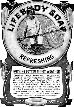 Lifebuoy was introduced by Lever Brothers in 1895 in the United Kingdom. Originally a carbolic soap containing phenol, different varieties were later introduced without the medicinal carbolic smell, such as the coral-coloured Lifebuoy during the late 1950s and Lifebuoy Minty Refresher in 1966.[2] Lifebuoy was one of the most popular soaps in the United States from approximately 1923 to the mid-'50s,[3] when perfumed soaps took over the market. It was North America's best-selling medicated/health soap until roughly 1951. It was well known for its red and yellow packaging, red color, octagonal shape, and carbolic aroma. Due to declining sales sometime in 1951 or 1952, Lever Bros. experimented with adding perfumes to the soap and made the changes permanent in 1954. Earlier experiments in 1936, 1938, 1939, and 1940 also added an artificial scent to the soap but generally lasted only one batch. Sales, however, continued to decline until 2006, when Lifebuoy was officially completely pulled from the American market. Lifebuoy's popularity reached its peak between 1932 and 1948. After World War II, when more materials were available, and rationing was over, other soaps began to take hold of the market. Its popularity waned steadily through the 1950s. It saw a popularity surge in the mid/late 1960s, which would last through 1973. This was partly caused by the introduction and success of Lifebuoy White in the American market. After this decline, the Lifebuoy brand was seen less and less in the American market. It was pulled from American shelves starting in 2003 and was completely phased out of the American market by 2006. Sometime in 2008 or 2009, Unilever released Lifebuoy Classic, a modern soap with retro packaging and a medicated scent intended to be similar to that of the 1950s product, as a tie-in novelty product sold through the official A Christmas Story website.