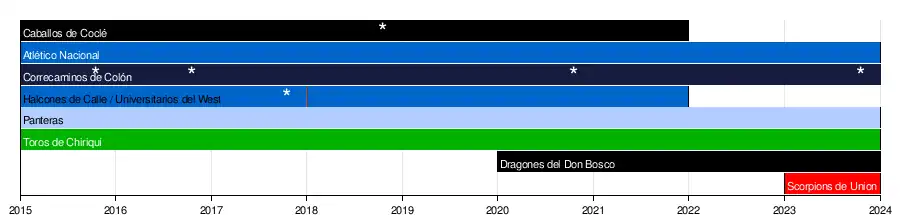 The league was established on June 3, 2015 by the Federación Panameña de Baloncesto (FEPABA).[3] Six newly established clubs entered the inaugural season of the league. The first game was played on October 2, 2015, between the Águilas de Río Abajo and the Caballos de Coclé. On December 15, 2015, the Correcaminos de Colón won the first-ever league title.[4]