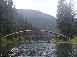 The lake is skirted by a 9 km level-grade hiking-only trail, which can be halved by taking the Rainbow Bridge at the narrows of the lake. The day-use parking area serves also as a parking area for the Windy Joe, Mount Frosty, and Lightning Lakes Chain hike.