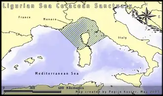 Originally called the International Ligurian Sea Cetacean Sanctuary (Ligurian Sea Sanctuary), what is now known as the Pelagos Sanctuary for Mediterranean Marine Mammals is a Marine Protected Area aimed at the protection of marine mammals (cetaceans). It covers an area of approximately 84,000 km2, comprising the waters between Toulon (French Riviera), Capo Falcone (western Sardinia), Capo Ferro (eastern Sardinia) and Fosso Chiarone (Tuscany).