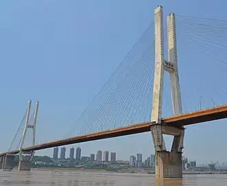 The Lijiatuo Yangtze River Bridge is a cable-stayed bridge over the Yangtze River in Chongqing, China. Completed in 1995, it has a main span of 444 metres (1,457 ft), placing it among the longest cable-stayed bridges in the world. The bridge carries four lanes of traffic between the Banan District south of the Yangtze River and the Jiulongpo District to the north.