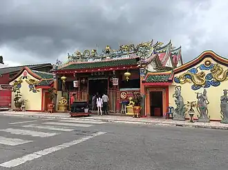The image of Lim Ko Niao was originally placed in small shrine, To Pikong Me, near the Krue Se Mosque.[7] The image was then moved to Leng Chu Kiang (Chinese: 靈慈宮; Pe̍h-ōe-jī: Lêng-Chû-kiong). This temple was originally named Zushigong Shrine (祖師公祠) dedicated to Master Qingshui – it was mentioned in Chinese temple record that such a temple existed in Kuala Bekah, Patani in 1547, the oldest-known temple dedicated to Master Qingshui in Southeast Asia.[8] It is said that a Chinese leader named Luang Cheen Kananurak refurbished the temple and moved the carved image of Lim Ko Niao here in 1879,[9] The temple was renamed Leng Chu Kiang after the image of Lim Ko Niao was moved there, and it is now commonly referred to as the Chao Mae Lim Ko Niao Shrine.[3] Lim Ko Niao has association with pearls, and the figurine is therefore decorated with pearl necklaces, and worshippers may also wear strings of pearls.[10] A number of other deities also worshipped in the temple, such as Mazu and Fude Zhengshen. The temple was partly rebuilt in 1912 and in 1969.[3]
