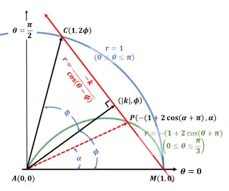 The construction of the outer loop of reveals its angle trisection properties.[5] The outer loop exists on the interval . Here, we examine the trisectrix property of the portion of the outer loop above the polar axis, i.e., defined on the interval .