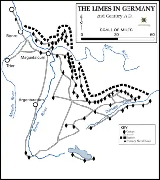 ![]() The limes Germanicus, 2nd century (Note: Mogontiacum is misspelled) | |