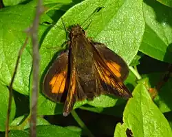 Limochores mystic,[1] the long dash or long dash skipper, is a species of butterfly. The species is commonly found in north of North America and in mountains in the south of North America, in grassy habitats.[2] The grassy areas include meadows, marshes, streamsides, wood edges, and prairie swales. On the top, the species has dark brown reddish to yellowish-orange markings. The forewing of the female has a broad black patch at the base. The forewing of the male has a long, slightly curved stigma which may be connected to the dash near the apex. Underneath the hindwing, the species is orange brown with a curved band of equal-sized yellow spots.[3]