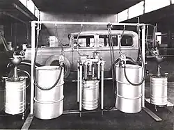 Despite the pressures of a long-term suit, the company developed the first drum pump for transferring lubricants from the original refinery containers. Lincoln developed the first portable oil drain and a quick detachable air coupler. These innovations led to complete lubrication pumps and swivel assemblies that dispensed lubricant directly from the original refinery container to an automobile on an overhead lift. Service stations, car dealers and mechanics began to heavily promote their lubrication services and Lincoln developed white drum sleeves to cover the refinery containers. (Fox)