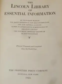 The first edition of the Lincoln Library of Essential Information was published in 1924 by the Frontier Press of Buffalo, New York. It had 2,054 pages and was compiled by Michael J. Kinsella. While primarily a one volume publication during this time, two volume versions of the book were available from 1928, with the full index reproduced in both volumes. The encyclopedia was topically arranged and revised at two year intervals. By the 27th edition, published in 1967, it had 3 million words and a 20,000 entry index.[1] The set was named after Abraham Lincoln; as the title page said "Named in honor of Abraham Lincoln whose inspiring example illustrated the possibilities of self-education".[2]