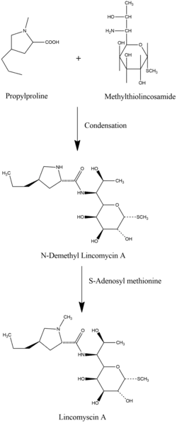 Biosynthesis of lincosamides occurs through a biphasic pathway, in which propylproline and methylthiolincosamide are independently synthesized immediately before condensation of the two precursor molecules. Condensation of the propylproline carboxyl group with the methylthiolincosamide amine group via an amide bond forms N-demethyllincomycin. N-Demethyllincomycin is subsequently methylated via S-adenosyl methionine to produce lincomycin A.[5][6]