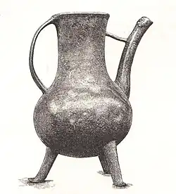 In 1790 Smith records that a bronze tripod ewer was found in Lindston Loch, measuring 9+5⁄8 inches high, by 3+1⁄4 inches across the mouth, spreading out to 4+1⁄8 inches. It has a spout and handle and is regarded being of late medieval origin; for many years it was kept at the Dalrymple Manse.[4] A bronze tripod ewer, with spout and handle, almost identical to the Lindston Loch specimen, was found at nearby Skeldon.[5] The old Roman road from the Solway Firth and the Clyde ran near here, passing from Causeway Farm onto Perclewan and Lindston. The above mentioned ewer was found near this road;[6] a glazed pitcher of earthenware was found at Perclewan near the old road in 1833, bearing the figure of a man's face and hands on the front.[6]