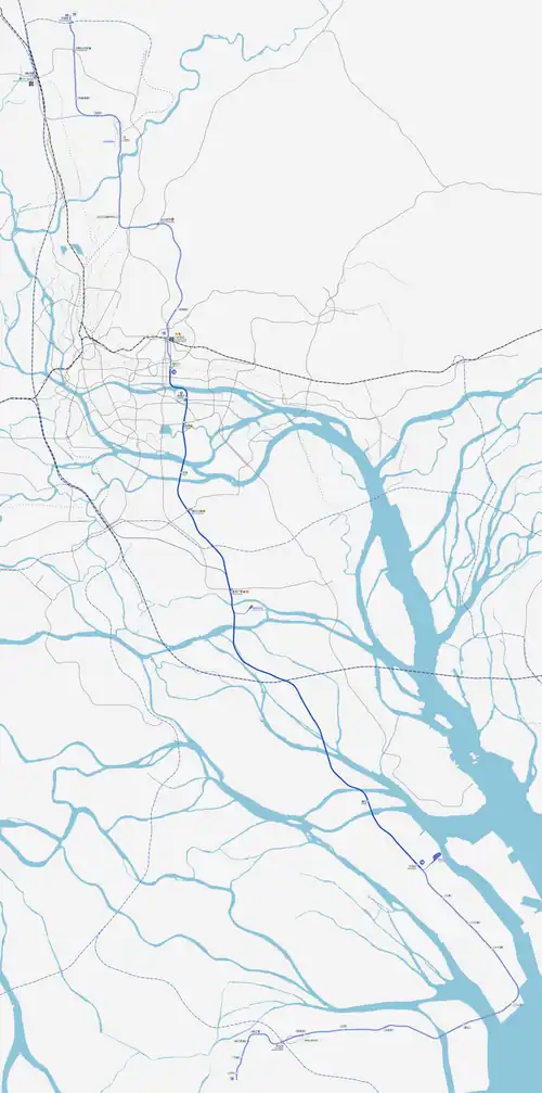 The 61.3 km (38.1 mi) line, roughly north-south, connects Wanqingsha in Nansha District with Guangzhou East Railway Station, with only seven stations in between, Hengli, Panyu Square, Nancun Wanbo, Shaxi, Longtan, Modiesha, Xiancun.[3] The line uses 8-car Type D trains with an operating speed of 160 km/h (99 mph).[8] This high speed can be sustained especially on the 26 km (16 mi) section between Panyu Square and Hengli stations.