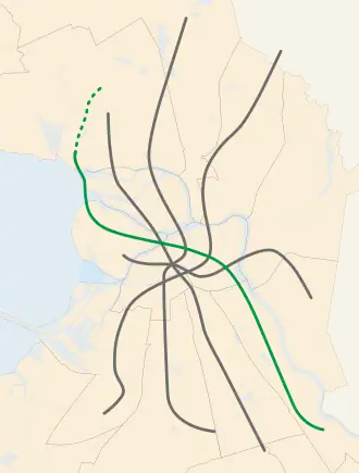 The line cuts Saint Petersburg centre on an east–west axis and then turns southeast following the left bank of the Neva River. It is generally coloured green on Metro maps.