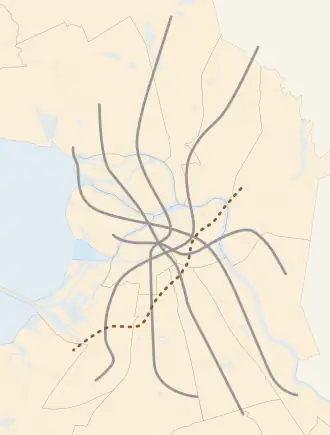 Krasnoselsko-Kalininskaya line (Russian: Красносе́льско-Кали́нинская линия), or simply line 6, is a passenger rapid transit line of the Saint Petersburg Metro system currently under construction. It is identified by the livery colour of brown. Train service is expected to begin in 2025 with 2 stations (Yugo-Zapadnaya and Putilovskaya) initially, and 4 more stations inaugurated later in 2029. The line lies from Krasnoselsky District, then travels northeastward, with interchange stations allowing passenger transfer with line 1, line 2 and line 5.