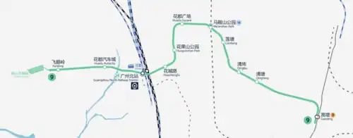 Line 9 of the Guangzhou Metro is a rapid transit line running across the Huadu District. It starts at Fei'eling and ends at Gaozeng. Its only interchange is with Line 3 at Gaozeng. The total length is 20.1 km (12.49 mi) with 11 stations. Line 9's color is pale green. Line 9 was opened for operation on 28 December 2017. [2]