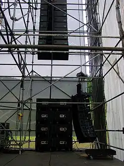 The large format line array has become the standard for large concert venues and outdoor festivals, where such systems can be flown (rigged, suspended) from a structural beam, ground support tower[2] or off a tall A-frame truss tower.[3] Since the enclosures rig together and hang from a single point, they are more convenient to assemble and cable than other methods of arraying loudspeakers. The lower portion of the line array is generally curved backwards to increase dispersion at the bottom of the array and allow sound to reach more audience members. Typically, cabinets used in line arrays are trapezoidal, connected by specialized rigging hardware.[4]