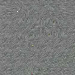 Because LIC does not encode flow orientation, it cannot distinguish between streamlines of equal direction but opposite orientation.[8] Oriented Line Integral Convolution (OLIC) solves this issue by using a ramp-like asymmetric kernel and a low-density noise texture.[8] The kernel asymmetrically modulates the intensity along the streamline, producing a trace that encodes orientation; the low-density of the noise texture prevents smeared traces from overlapping, aiding readability.