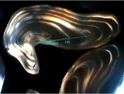Ages are determined from fins in much the same manner as for other aging structures: sections of varying thickness are examined under a microscope, and the annuli, or rings, that are formed for each year of growth are counted and used to estimate the age. The cross sections must be made at right angles to the length of the fin ray, and it is therefore important that fins be dried flat, with the cut surface at right angles to the fin rays. In addition, the distance the section is cut from the fin ray base is important, so all fins should be collected with the bases intact.[25][26]